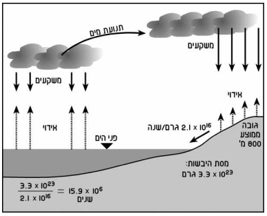 חשבון שנעשה כאן מקורב בלבד. חשבונות מקורבים יש בהם תועלת כל זמן שאנו מעריכים נכון את גבולות השגיאה שחוסר הדיוק מוביל אליה. שטח היבשות הוא בערך 149×10¹⁶ סמ"ר, גובהן הממוצע 800 מטר וצפיפותן הממוצעת (משקלן הסגולי) 2.8 גרם/סמ"ק. כלומר, מסת ("משקל") היבשות היא בקירוב 3.34×10²³ קילוגרם. אפשר לחשב כמה זמן ייקח להסיר נפח כזה של יבשות ולהובילן לים. נהר ממוצע מוביל לים 0.6 ק"ג חומר לכל מטר מעוקב מים (מ"ק, 1000 ליטר) שחלקו חומר מרחף (חול וחרסית) וחלקו חומר מומס. ספיקת כלל הנהרות בעולם היא כ-3.5×10¹³ מ"ק מים בשנה (מכפלת כמות המשקעים השנתית בשטח היבשות, איור 1). מכאן שהם מובילים לים בערך 2.1×10¹³ ק"ג של חומר מומס ומרחף בשנה תמימה. כלומר היבשות כולן תובלנה לים ב-15.9×10⁶ שנים.