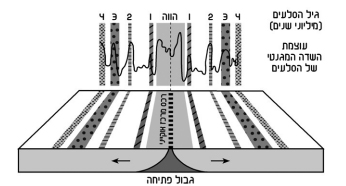 בשנות השישים החלו למפות את עוצמת השדה המגנטי של כדור הארץ באוקיינוסים (כאמור, במידה רבה בעזרת מכשור שפותח לשם מעקב אחר צוללות). שני מדענים אנגלים מקיימברידג', פרד ויין (Fred Vine) ודרמונד מתיוס (Durmond Matthews), הציעו ב-1963 הצעה נועזת: אם נקבל שתי הנחות, האחת שברכס המרכז האוקייני נוצרת כל הזמן קרקעית אוקיינית בזלתית חדשה, כלומר "קרקעית האוקיינוס מתפשטת" (Sea-floor spreading), וקרקעית בזלתית זו רושמת בתוכה את כיוון השדה המגנטי בעת שנתקררה מתחת לטמפרטורת קירי, והשנייה, שתוך כדי התפשטות זו מתחלף השדה המגנטי של כדור הארץ מדי פעם, הרי החילופים גורמים לכך שפעם השדה המגנטי הנורמלי הממגנט את הסלעים מחזק את השדה הכללי העכשווי, ופעם, כששדה כדור הארץ הפוך, הוא מחליש אותו. כלומר, בעולם שבו קרקעית האוקיינוס מתפשטת והשדה המגנטי מחליף קוטביות נצפה לא רק לחתך עמודי כמו שתיארתי (וראו איור 20) אלא לרצועות של שדה מחוזק ומוחלש, סימטריות משני צידי הרכס. אם נצבע על גבי מפה רצועות של אנומליות חיוביות בשחור ורצועות של אנומליות שליליות בלבן – תיראה התבנית כעור זברה. ואכן, שלוש שנים מאוחר יותר מופו תבניות כאלה על קרקעית האוקיינוס (ראו איור 21).