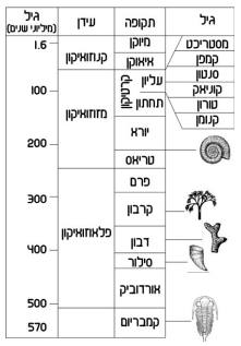 בסלעי משקע שנמצאים נמוך מאוד בטור הסלעים, כלומר בסלעים עתיקים מאוד, אין מאובנים ברורים הניתנים לזיהוי כאורגניזמים – אמנם יש בהם אצות מאובנות, אך לא מאובנים של אורגניזמים בעלי שלד. אלה הופיעו בפריחה פתאומית, גלובלית, והיו עשויים קרבונט, פוספט או תחמוצת צורן. המאובנים בוני השלד הראשונים קרובים לפרוקי הרגליים (Arthropoda) המוכרים לנו היום. גופם מחולק לשלוש אונות. אלו הטרילוביטים והם הופיעו, פרחו ונכחדו. אחריהם הופיעו יצורים דמויי תולעים – קווצי העור (Echinodermata) – גרפטוליטים, אחריהם דגי סחוס, ואחריהם דגי העצם. בשלב מסוים הופיעו האמוניטים – רכיכות בעלות קונכייה דמויות הנאוטילוס המודרני (אף כי הן לא בדיוק קרוביו) – שהם בעלי מגוון רחב מאוד של מבנה וצורה (ראו איור 24). בשלב מאוחר יותר הופיעו הדינוזאורים – קבוצה של בעלי חיים קטנים וגדולים, טורפים וצמחונים, עפים, שוחים והולכים על שתיים ועל ארבע. אבולוציה רבה חלה בקבוצת מאובנים של אורגניזמים חד-תאיים ימיים, הפורמיניפרים, שהם סַמָן סטרטיגרפי יעיל מאוד.