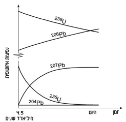 שני איזוטופי האורניום הם זוג יפהפה: שני איזוטופים של אותו יסוד (U-238 ו-U-235) הדועכים בקצב שונה (כלומר שיש להם מחציות חיים שונות) לשני איזוטופים של יסוד אחר – העופרת (²⁰⁷Pb ,²⁰⁶Pb) (ראו איור 28). בטיפול נכון בתכונה מקסימה זו אפשר להגיע להישג אינטלקטואלי עצום של המאה העשרים והוא קביעת גיל כדור הארץ ומערכת השמש. ארתור הולמס, שכבר הזכרנו אותו לטובה בפרק קודם, היה מן הראשונים שניצלו תכונה זו של מערכת האורניום־עופרת לתארוך כדור הארץ. המשיך במפעל זה הגיאוכימאי האמריקאי קליר פאטרסון, שהיה הראשון שקבע את גיל הכדור קרוב מאוד לערך המקובל היום: 4,560 מיליון שנה (ראו איור 29).